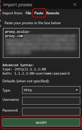 3. Switch to the Paste tab.4. Log in to your Oculus dashboard and click Show Configured List.5. Under the Generic tab, copy the provided proxy code.6. Return to OpenBullet and paste the proxy details into the proxies field.7. Once added, click Accept to confirm and save the settings.