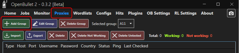 1. On the OpenBullet dashboard, go to the Proxies tab.2. Click Add Group to create a new proxy group.